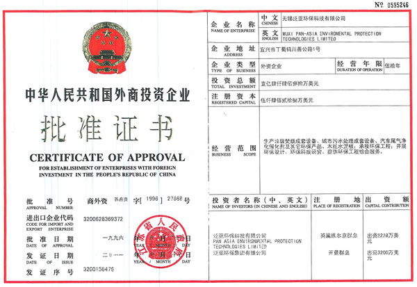 Construction enterprise qualification certificate of Wuxi Pan-asia Environmental Protection Technologies Limited (environmental engineering contractor level 1)